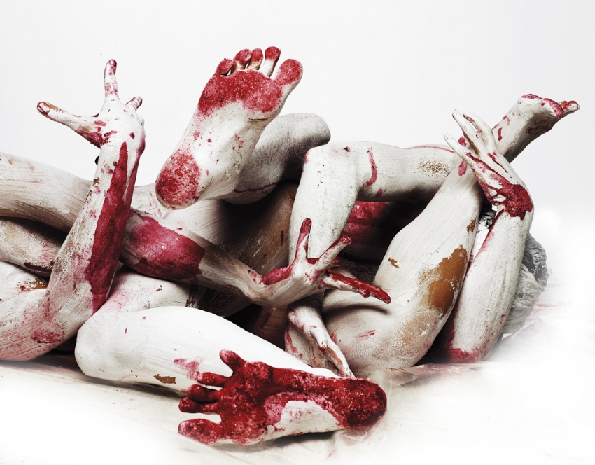 Iero Sfagio (trans: Holy Slaughter) is a photo project which resulted in an installation within the Athens meat market area in 2008. Vrettos cooperated with the dance company Roes, for a folio as a creative understanding of their dance performance ‘Electra Perpetrator’. His photos, shot in the white background of his studio, were presented as an installation within the meat market shops, along with the live performance of the dancers of the aforementioned play.